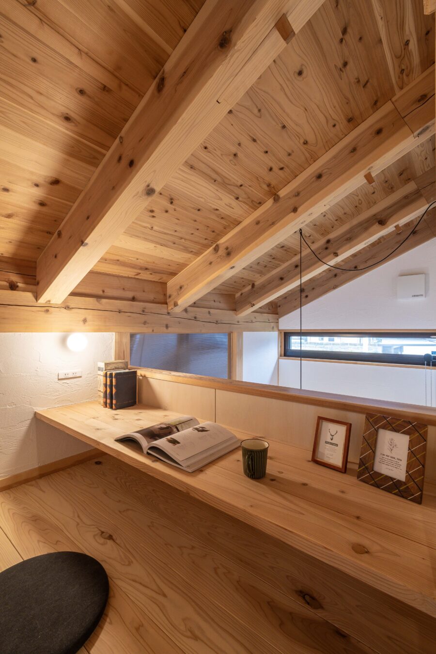 上部の吹き抜けには、1.5畳のこもれる書斎と子供部屋がつながっており、帰ってきた家族をどこでも迎える事ができます