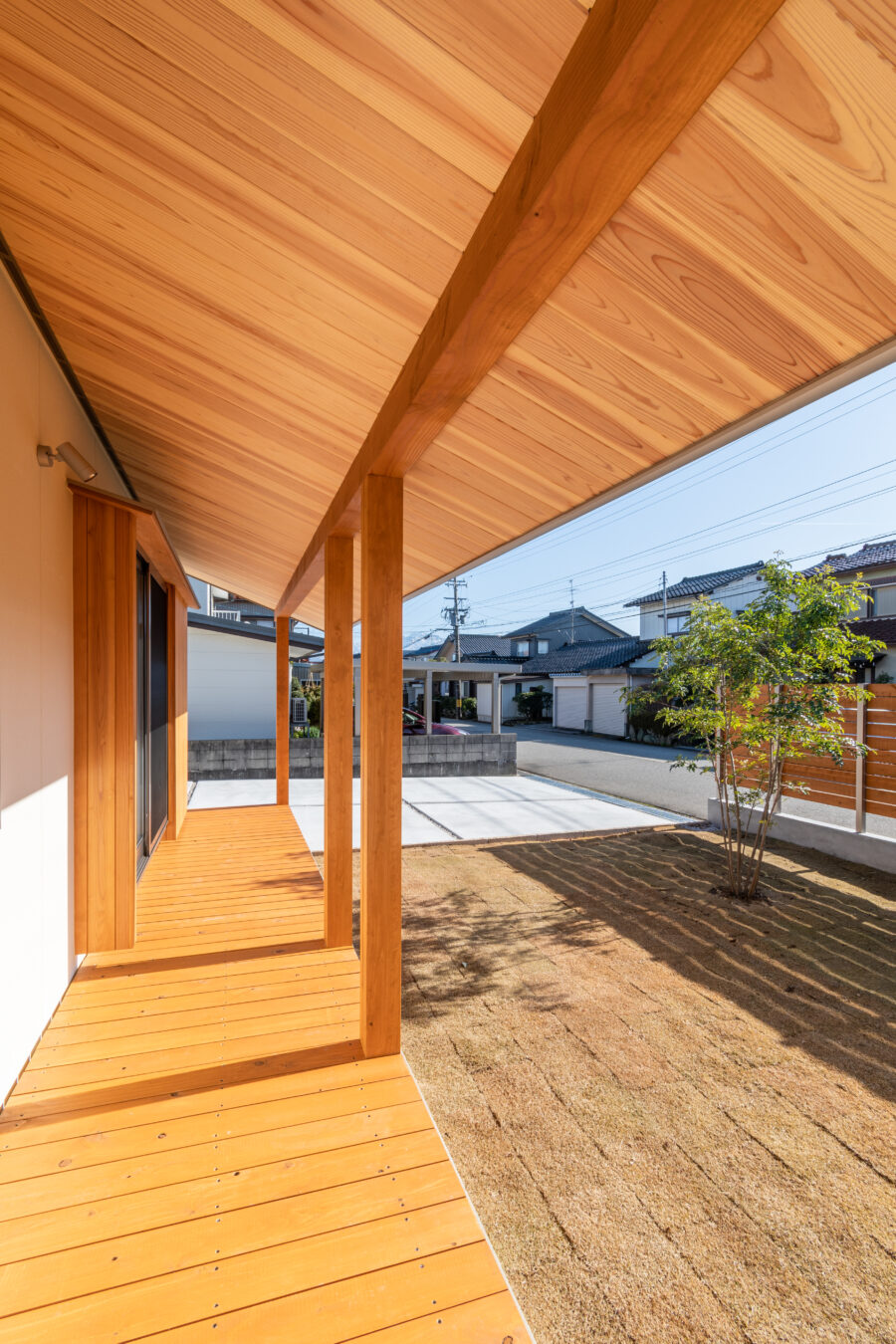 深い軒が雨を遮り、屋根の低い水平ラインで、夏の日射しを遮ります。